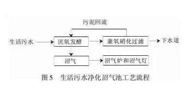 12、生活污水净化沼气池:新型生活污水厌氧净化池(或称城镇生活污水净化沼气池)是一种小型分散化污水处理装置。生活污水净化沼气池是在化粪池和沼气池的基础上发展起来的,解决了化粪池处理效果差、沉积污泥多、沼气池沼气回收率低的弊端,其工艺流程见图5。