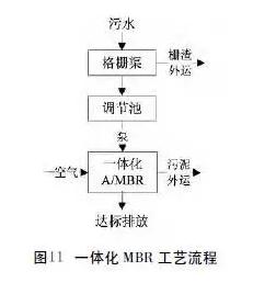 22、一体化MBR工艺:一种将活性污泥法和一体化浸没式膜分离系统结合的传统改良型工艺,利用膜组件进行的固液分离过程取代了传统的沉降过程,能有效的去除固体悬浮颗粒和有机颗粒,制备无菌水。系统出水可直接用于生产或生活回用。废水通过本处理系统处理排放出水的各项指标均可以达到《城市污水再生利用城市杂用水水质》的指定标准。该技术适用于有回用要求或用地紧张的的污水处理设施,处理规模20~500吨/天。工艺参数:缺氧反应区停留时间不小于2h,MBR区停留时间不小于4h,污泥理周期360天,工艺流程见图11。