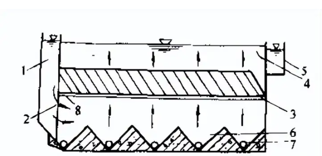 池平流式沉淀池呈长方形,污水从池的一端流入,水平方向流过池子,从池的另一端流出。在池的进口处底部设贮泥斗,其他部位池底设有坡度,坡向贮泥斗,也有整个池底都设置成多斗排泥的形式。