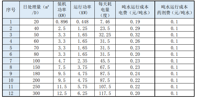 4、云南污水处理设备设备耗电量对比表: